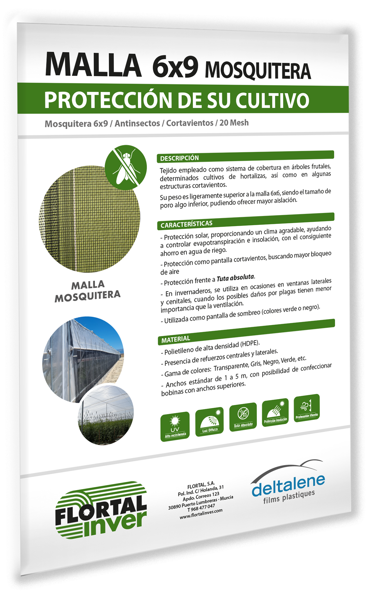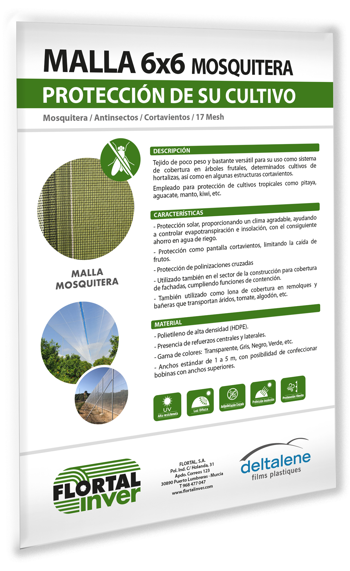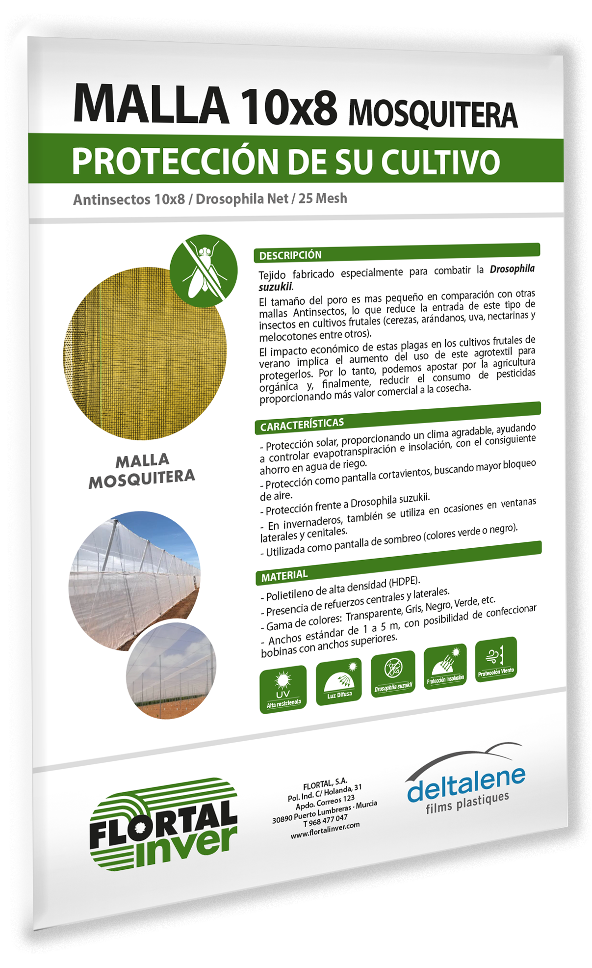 El tamaño del poro es mas pequeño en comparación con otras mallas Antinsectos, lo que reduce la entrada de este tipo de insectos en cultivos frutales (cerezas, arándanos, uva, nectarinas y melocotones entre otros).